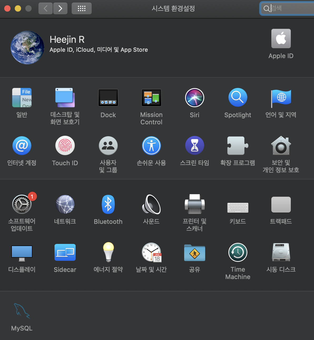 파일 설치 완료창을 확인한 뒤, 시스템 환경설정 창에 들어가서 가장 하단 MySQL이 다운로드 됐는지 확인한다.