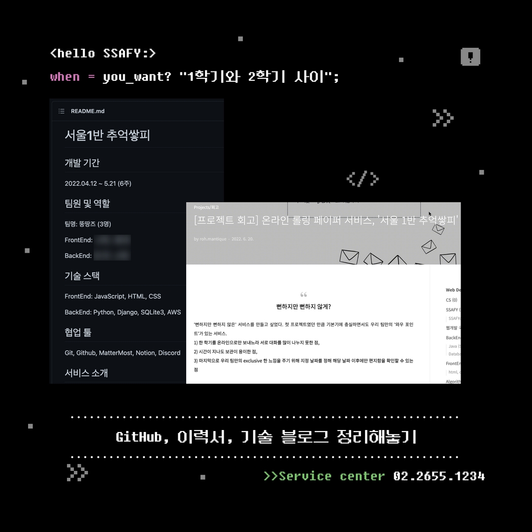 이력서를 틈틈이 업데이트 하는 것이 정말 중요합니다. 1학기를 마친 SSAFY인이라면 일단 어디에 내놔도 개발자로 살아남을 수 있는 역량을 충분히 길렀다고 생각합니다. 물론 아직 갈 길이 먼 것도 사실이지만 4개월간의 가파른 성장곡선을 자랑해주는 것도 필요합니다. 저는 1학기에 진행한 프로젝트 2개를 제 GitHub과 기술 블로그, 이력서 그리고 자기소개서에 어떻게 잘 정리할 수 있을까 깊이 고민했습니다. 물론 정말 기초적인 프로젝트지만, 몇 달 뒤, 몇 년 뒤의 제가 이때의 포트폴리오를 본다면 얼마큼 성장했는지 더 선명히 알 수 있을 테니까요. 정리와 더불어 취업하고 싶은 분야에 대한 고민, 업계에 대한 조사 역시 함께 이루어진다면 포트폴리오를 더 방향성 있게 만들어나갈 수 있다고 생각합니다. 저는 기술 블로그를 정리하면서 1학기 때 ‘왜 더욱 꼼꼼히 공부한 내용을 기록하지 않았을까?’ 하는 후회가 남더라고요. 프로젝트 회고를 하며 어떤 부족한 점이 있었는지, 어떻게 보완할 수 있었을지, 오류를 해결하며 배운 점은 무엇인지 등. 더욱 꼼꼼하게 돌아볼 수 있어서 제 프로젝트에 한층 더 애착이 생겨서 정말 값진 기록이었습니다. 정리와 더불어 주변의 현업 개발자, SSAFY의 취업 컨설턴트 등에게 첨언을 구해보는 것도 방법이랍니다. 혹독한 피드백은 언제나 환영이니까요! 성장의 기회 달갑게 맞이합시다!