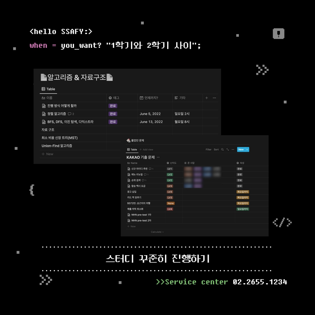 2학기에 들어서기 전 취업에 성공해 분위기가 많이 싱숭생숭할 수도 있을 텐데요. 그럼에도 불구하고 기존에 해오던 스터디를 진행하는 게 정말 중요하다고 생각합니다. SSAFY에 들어온 이상 SSAFY 수료나 취업 성공만이 목적이 아니잖아요? 꾸준한 공부와 성장은 개발자의 숙명이기 때문에 1년 내내 스터디를 진행하며 ‘성장의 감각’을 가지고 가는 게 중요하다고 생각합니다. 제가 속한 스터디는 지금은 휴식기를 가지고 있지만, 6월 중순까지 알고리즘 문제 풀이와 자료구조 CS 스터디를 진행했습니다. 1학기 때 스터디 멤버와 쭉 함께하는 것도 좋지만 취업 성공 등의 이유로 해체되는 경우도 있으니, 2학기 때 새로운 스터디를 구해보는 것도 방법이지요! 중요한 건 쉬지 않고 꾸준히 해야 한다는 것. 잊지 마세요 :)